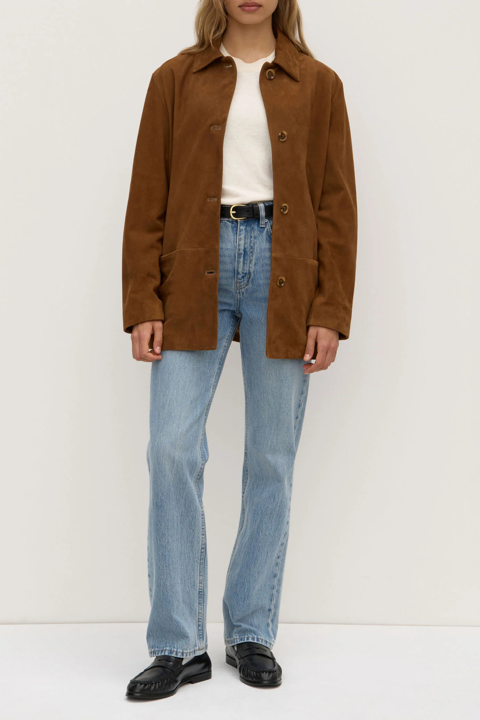 Elevate any look with the Goat Leather Suede Jacket. Cut in a timeless, boxy silhouette, this collared style its crafted from a super-soft Italian goat leather suede and features a button-down front and side pockets.
