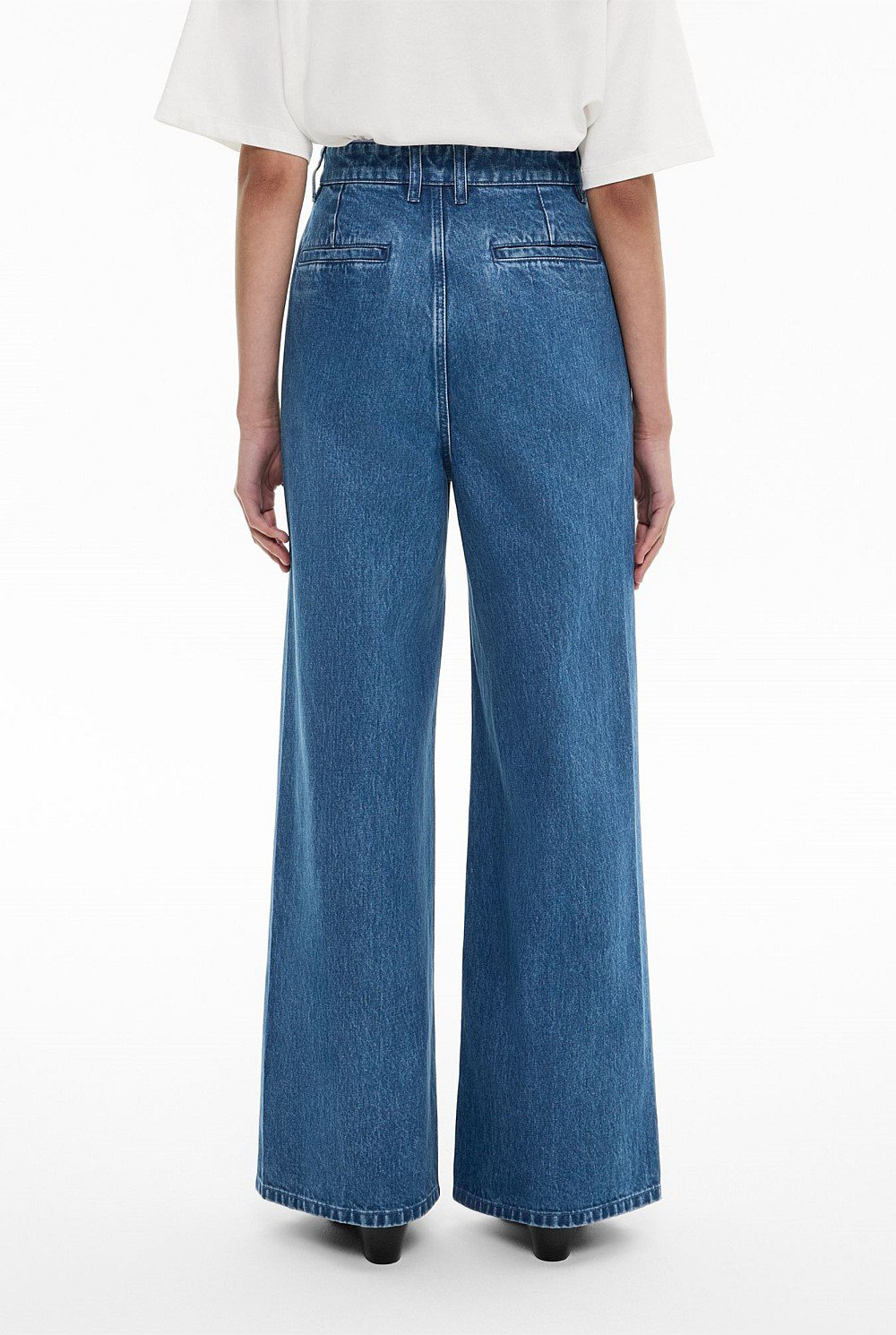 Modern and effortless, the High-Waisted Wide-Leg Jeans emerge as the ideal everyday bottom. Crafted from rigid denim these wide legged pants are cut with a high waist, four functional pockets and flattering pleated detailing. Style with a crisp white shirt and a heeled boot for an elevated office outfit, or dress them down with a boxy tee and a sneaker.