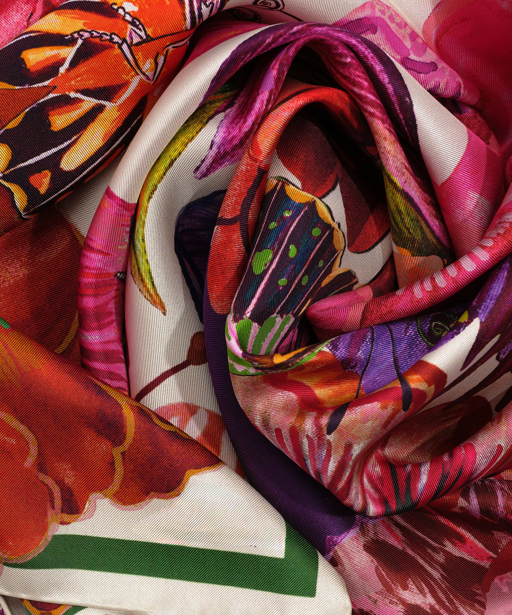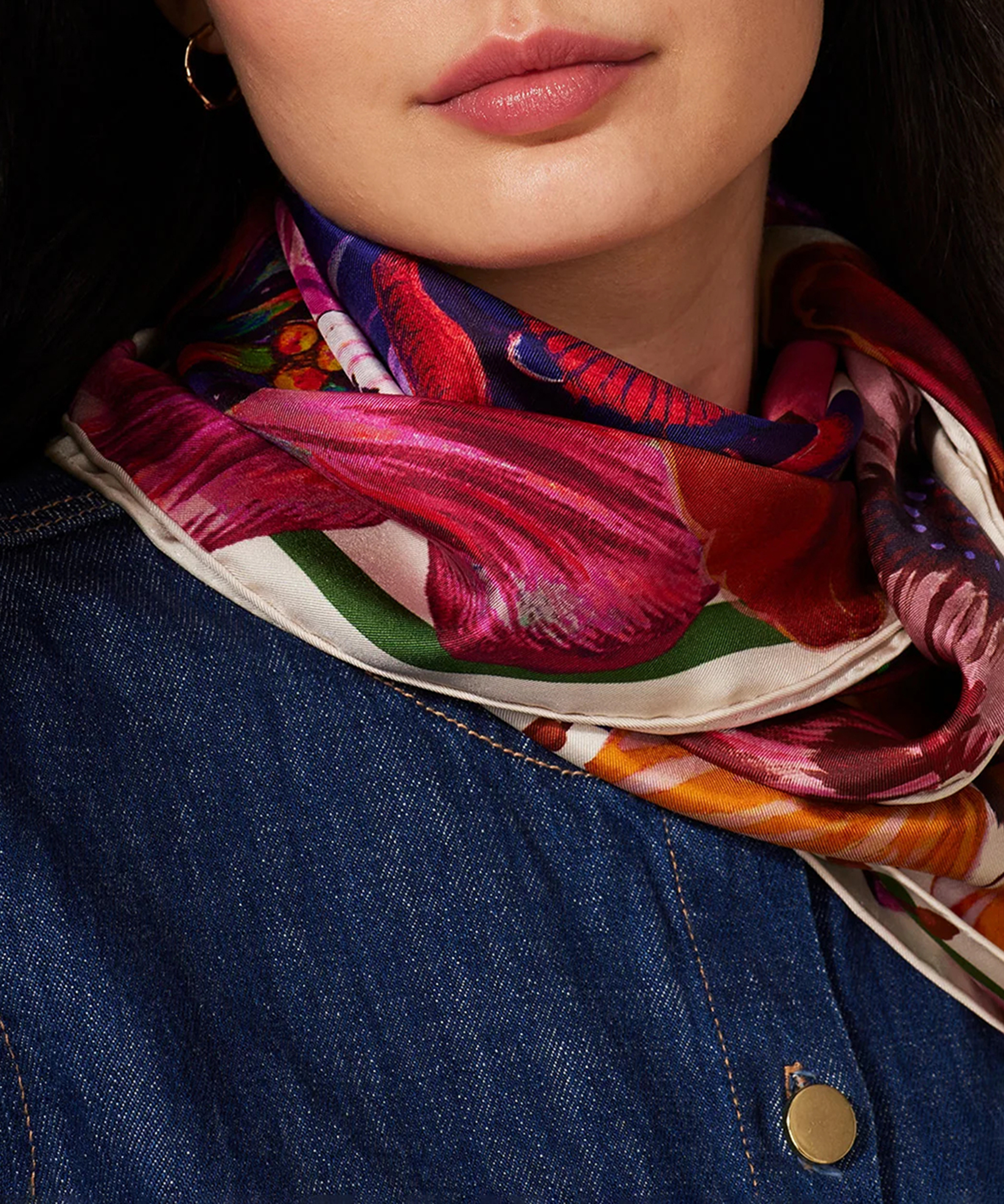 Bursting with vibrant blooms, this 100% silk accessory embodies the effortless sophistication inspired by the beauty of nature.