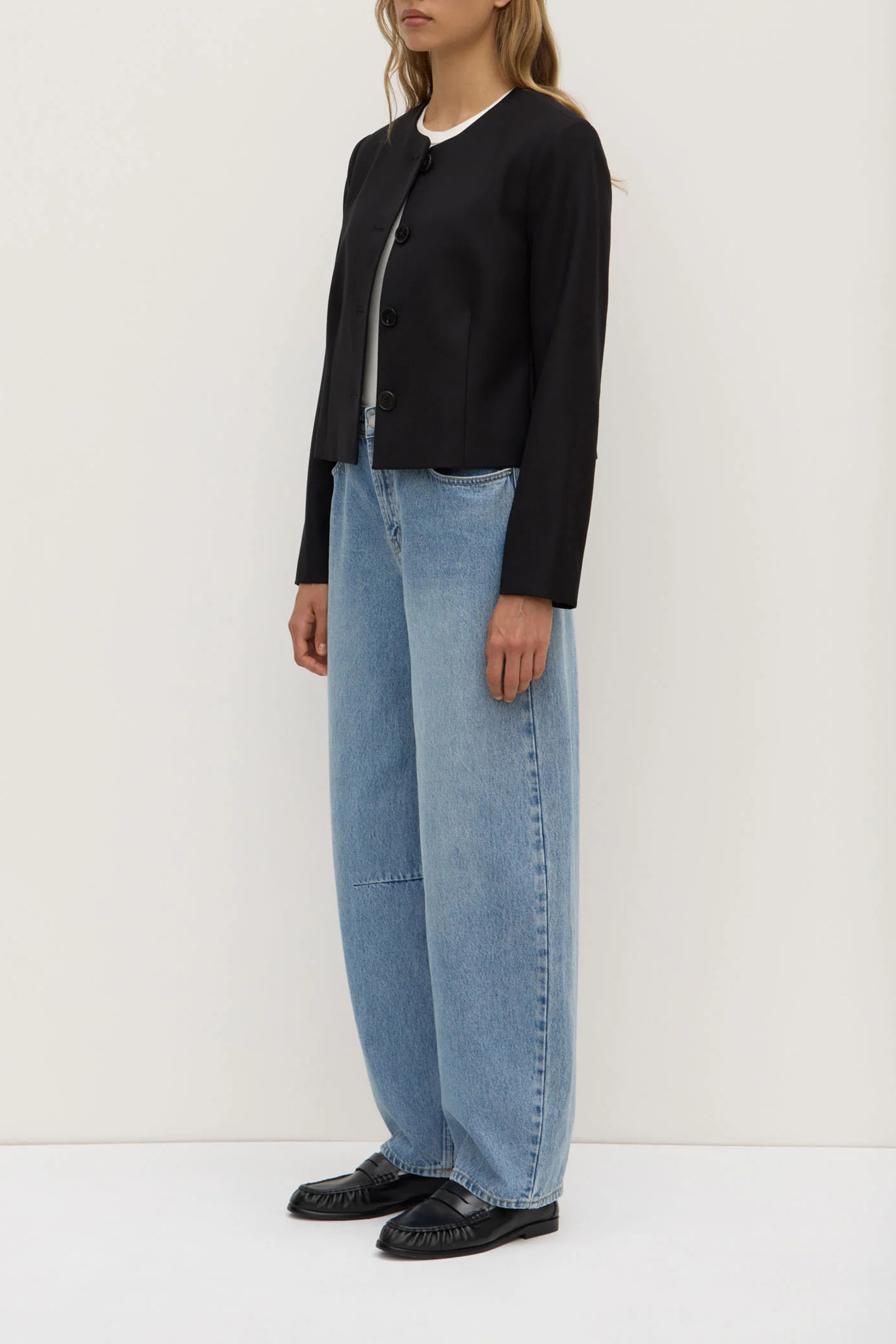 Boxy, tailored jacket crafted from 100% wool. Designed for layering over tees and shirting, it features a collarless crew neckline and button down front.