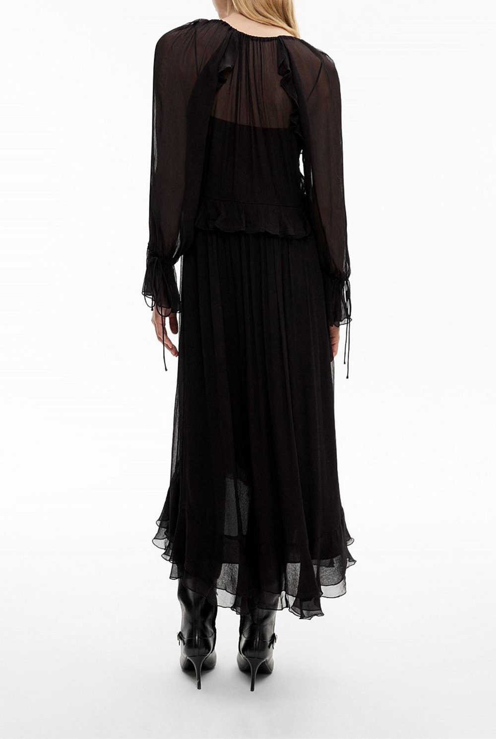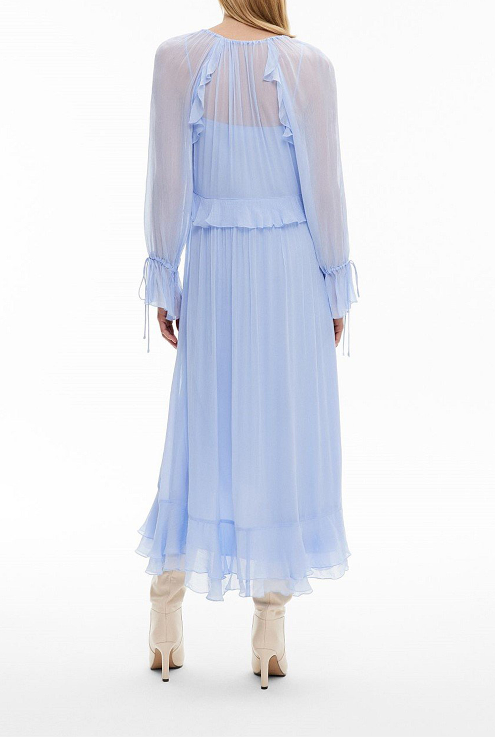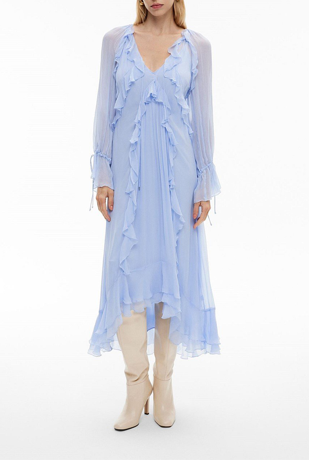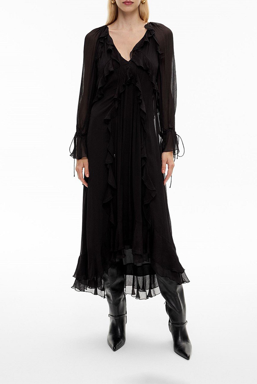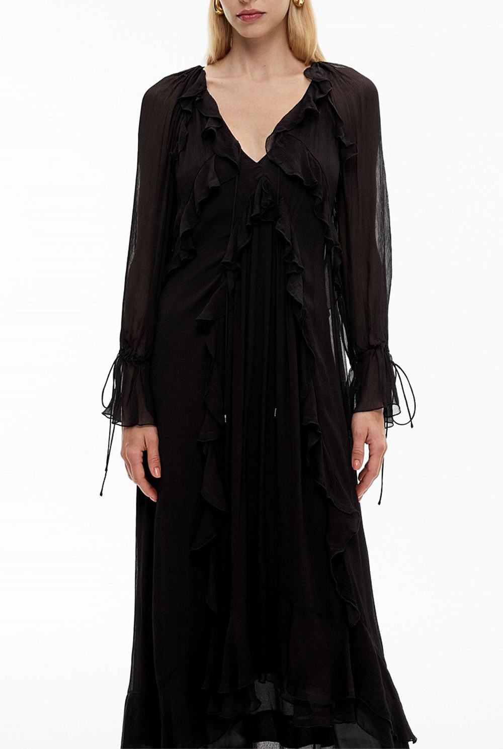 The Ruffled V-Neck Dressbrings effortless elegance to event styling. Featuring a delicate V neckline, an asymmetric hem and sheer, billowy sleeves, this dress emerges as a romantic contender for a night out. Style it with a heel and dainty jewellery for a feminine approach, or pair with a knee high boot and a trench to lean into the contemporary.