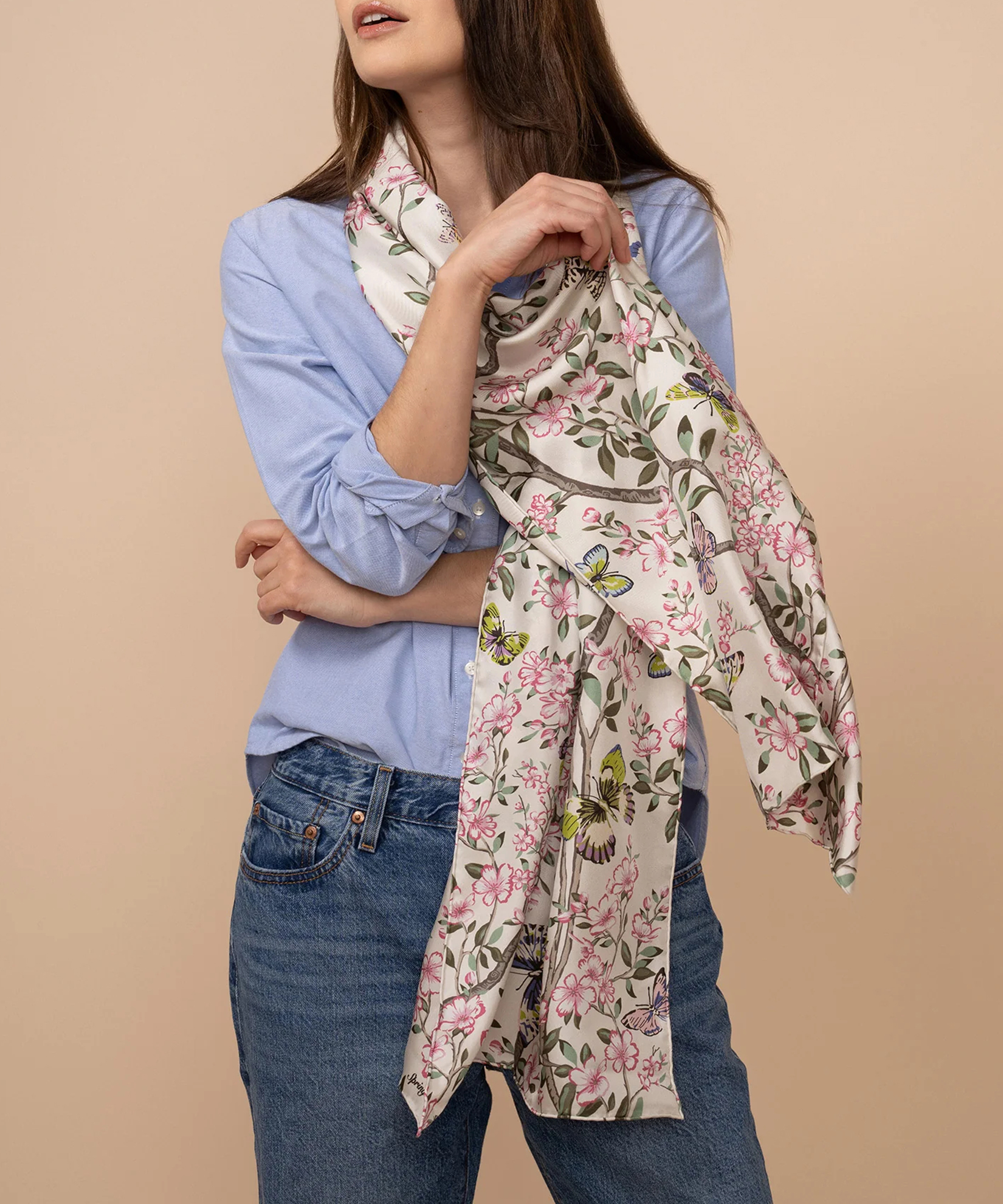 This silk oblong scarf features a cherry blossom scene; a tribute to the concept of fleeting time and living in the present.