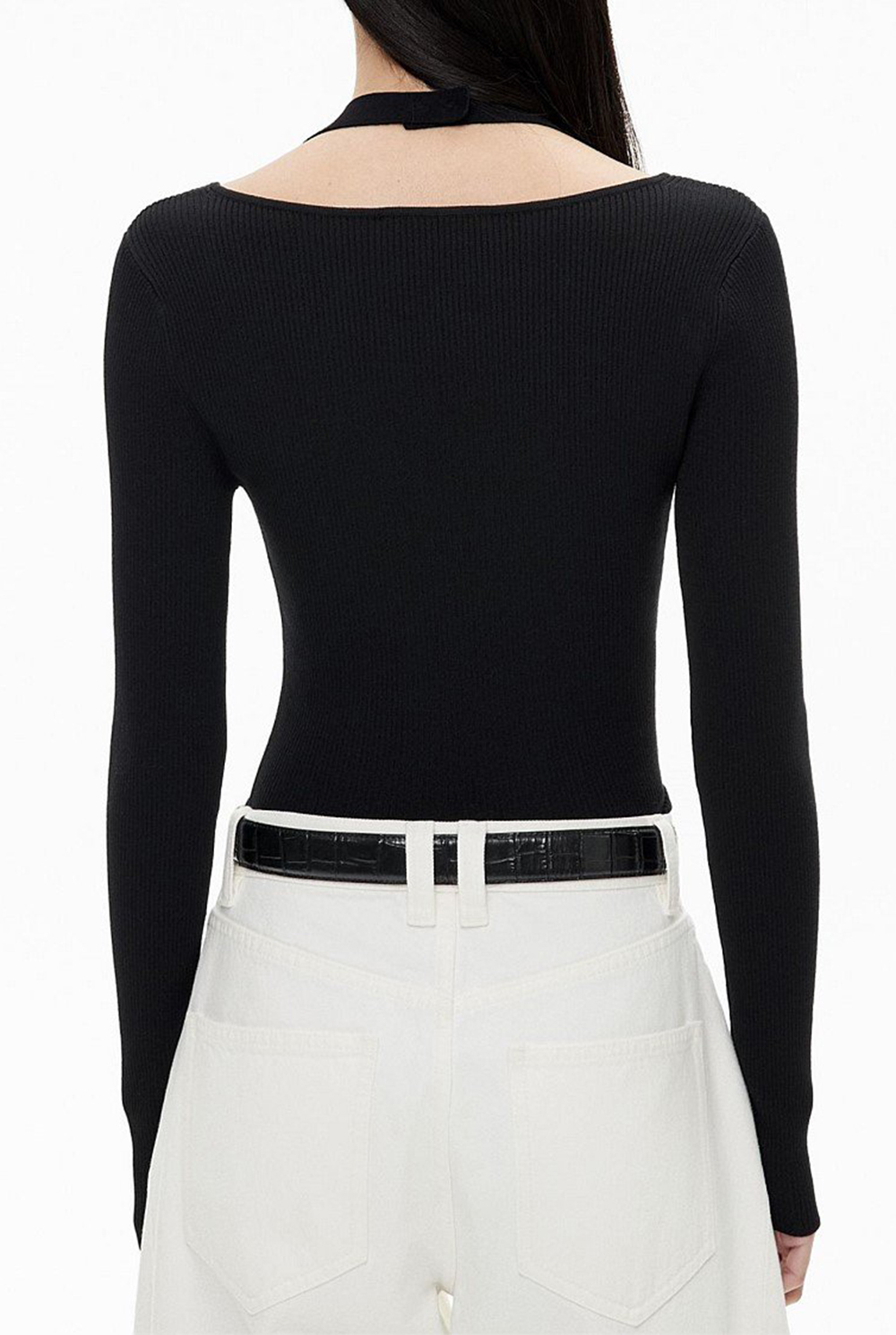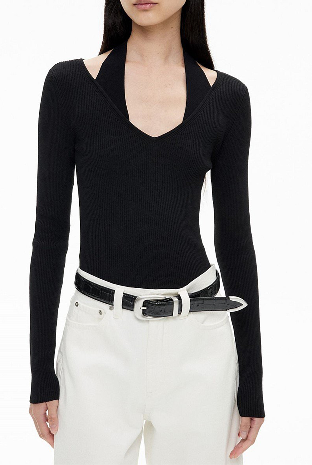 Bold and strappy, the Women's Turtleneck Sweater a contemporary edge to your winter wardrobe. A combination of a halterneck and a v-neck, this long sleeve bodysuit features geometric cut out details, long arms and a form fitting rib finish. Pair this with your go-to jeans and a heel for a modern edge.